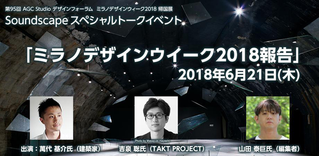 AGC旭硝子さんが発表した体験型インスタレーション作品”Soundscape”のクリエーションパートナーの萬代基介氏、編集者の山田泰巨氏と共に、ミラノデザインウィークについてお話しをする予定です。