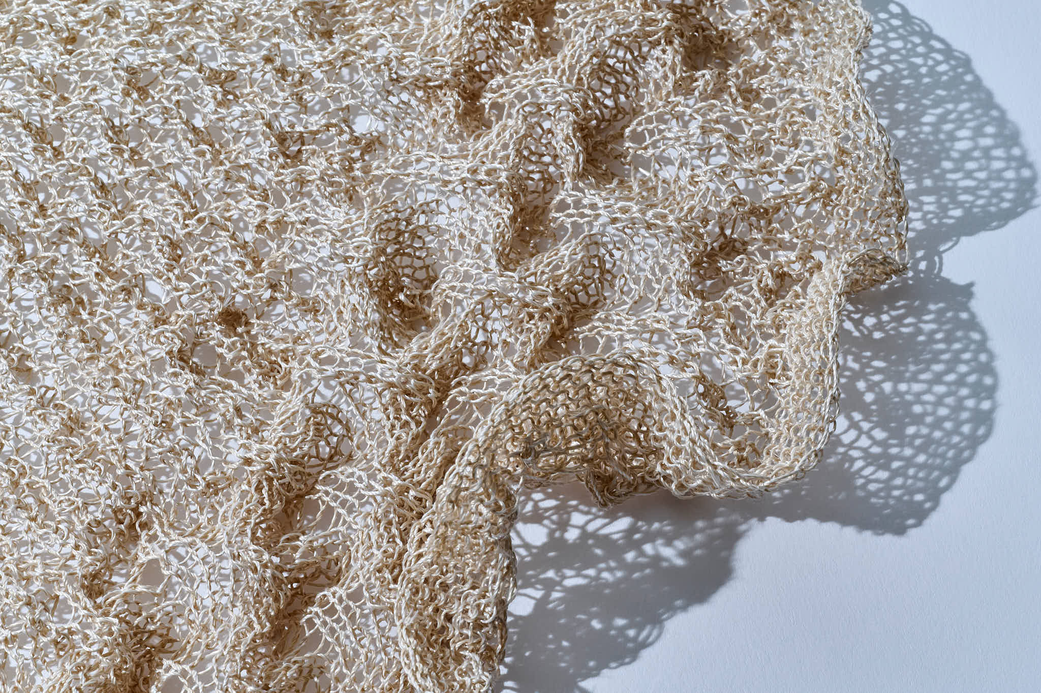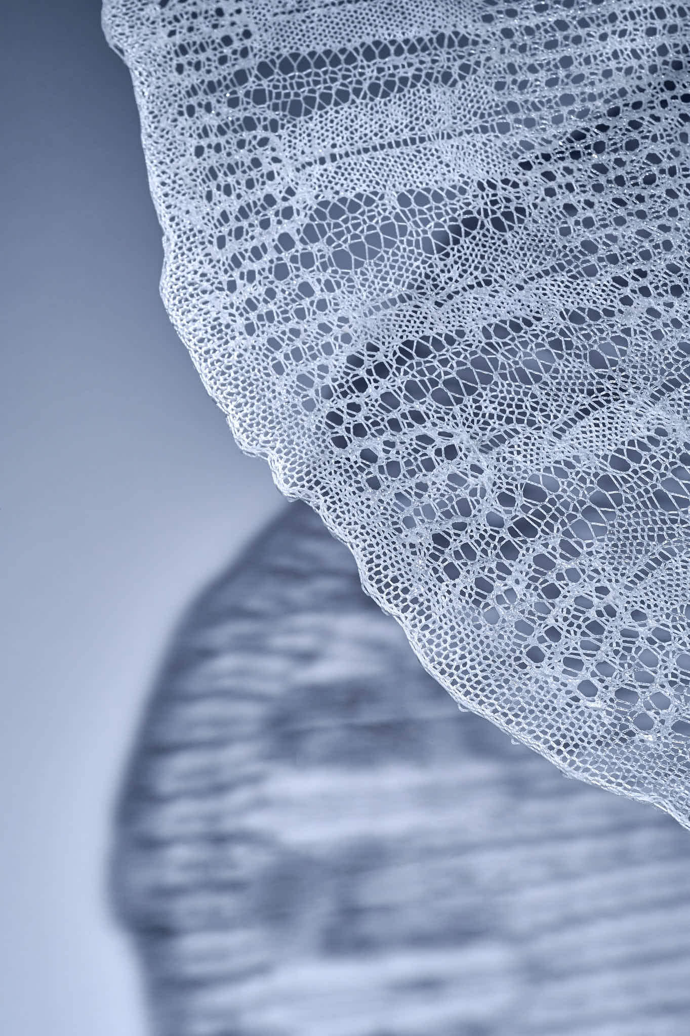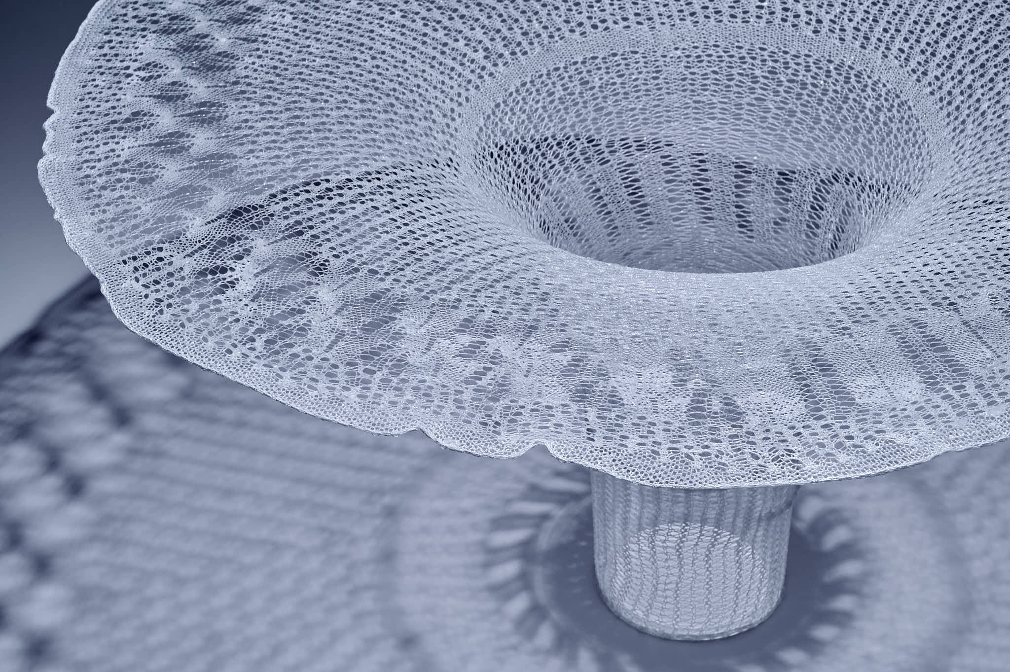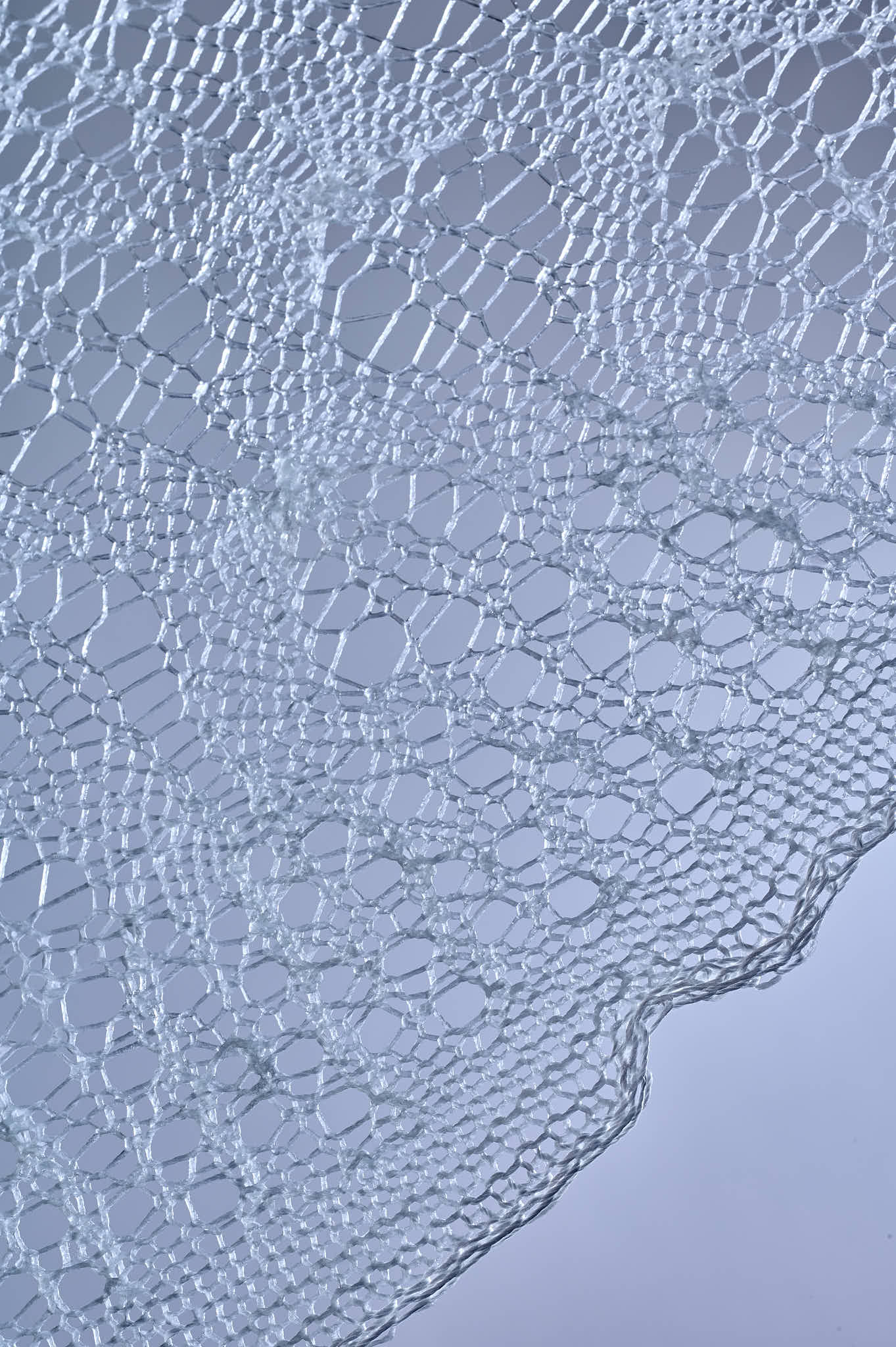 正確には「ガラス繊維」を、裁断も縫製もしない「ホールガーメント(※)」という立体的に編みあげる技術で編み、電気釜で焼成した作品です。ガラス繊維の"多く"は産業用途であり、ホールガーメントもまた"多く”はファッション産業で育まれた技術ですが、それら素材や技術自体は本来無色透明であり、無限の可能を秘めているはずです。そういった可能性の一端を探り、自由な視点でデザインを通して可視化する事に取り組んだ作品です。