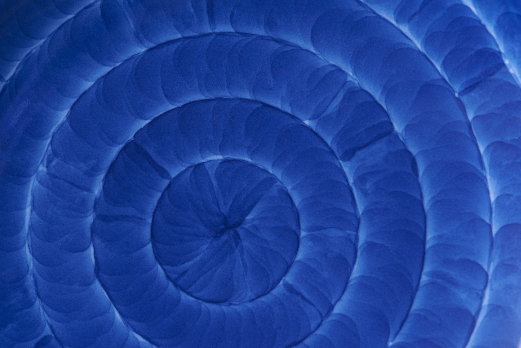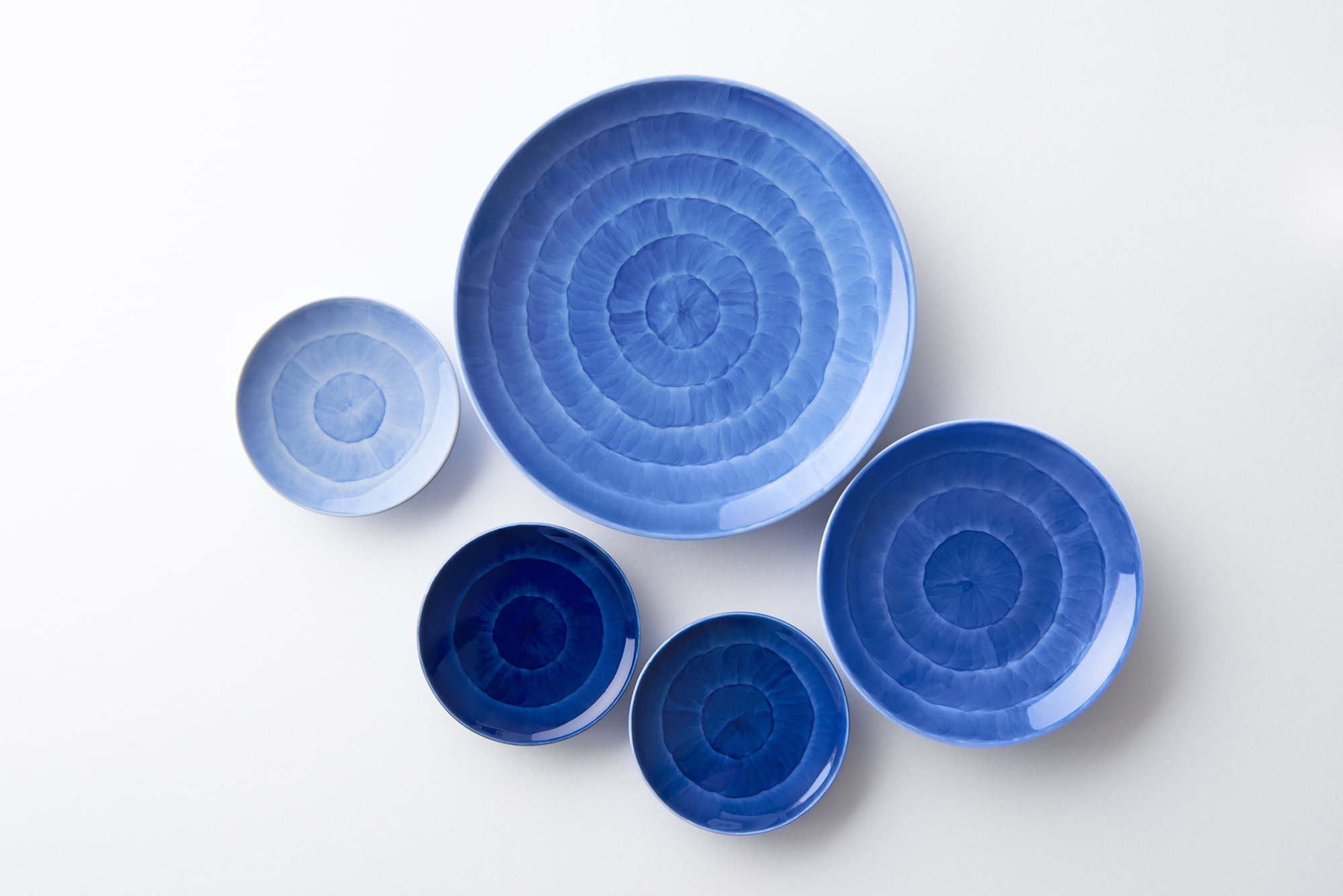 磁器に描かれた青色の様々な絵柄。その絵柄を表現するために用いられる青色の顔料は"呉須(ゴス)"と呼ばれる。江戸時代初期に、中国より有田にもたされたと考えられている呉須は、素焼きの状態で染め付けるため、その美しい青が色あせることがない。また、同じ配合量でも焼き上げの条件によって多様な青色の表情を生み出す。そんな呉須の美しさを、絵柄ではなく青色の美しさその物として楽しむことは出来ないだろうか。呉須の色味にこだわってうつわ作りを続けてきた副久製陶所と共に、5つの青を見いだした。また、釉薬がもたらす呉須との化学変化を調整し、呉須が器の表面に流れ出す、本来は避けられる表現にあえて取り込む事で、手仕事で器に定着させた呉須の顔料が、器を焼く事で青い花を咲かせるまったく新しい手法を考案した。それぞれに個性を持ちながらも焼く事でいっせいに咲き揃うその様は、まさに凛とした花そのものである。化学変化で花を描くこの手法は、人間が絵柄を描くこれまでの呉須の役割とは異なる、新しい可能性を見出した手法である。