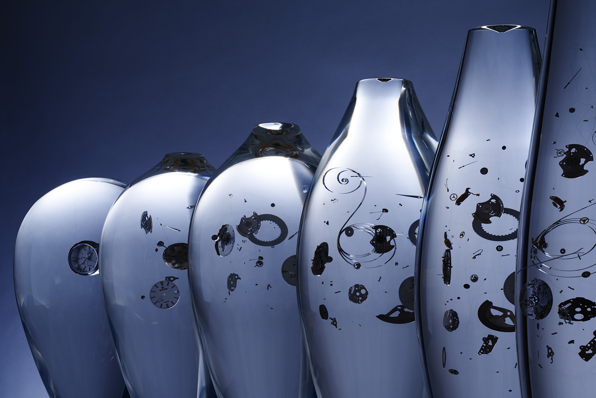 “THE FLOW OF TIME” is an installation for Grand Seiko at the Triennale Design Museum in Milan. This installation focuses on "Spring Drive," Grand Seiko's unique mechanism that combines high precision and long-term drive. The room expressed the worldview of Spring Drive, which approaches the essence of time and reaches a new dimension that makes you feel the transition of time. Twelve transparent objects enclosing movement parts are aligned, and an image depicting changes of time is projected behind them. When looking into the object, each twinkling part and the reflected image are merged together, giving the feel of the movement approaching the essence of time. Additionally, the small lights that twinkle in the transparent object quietly imply the existence of the weak electricity generated by the parts. It is an installation as a huge space device that allows you to experience the philosophy of Grand Seiko by looking into it.