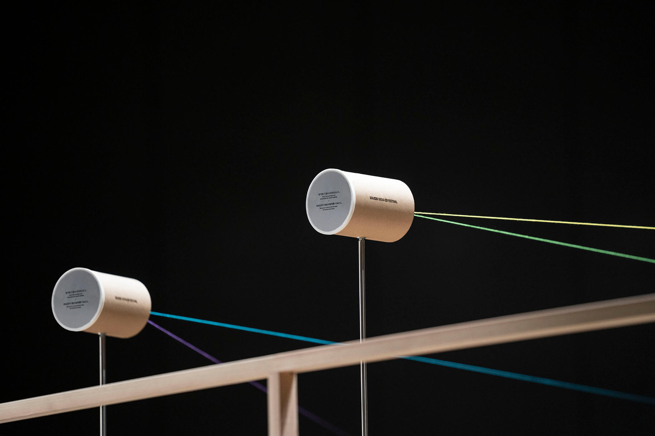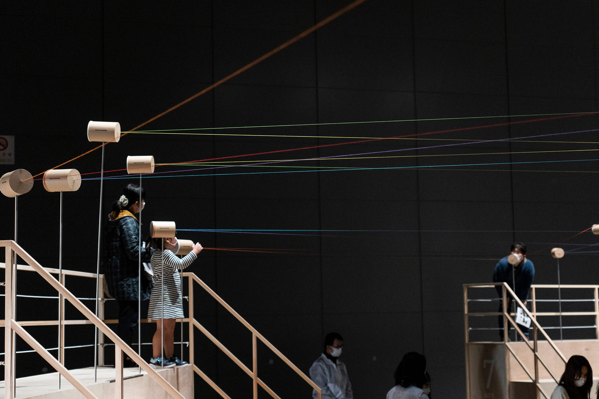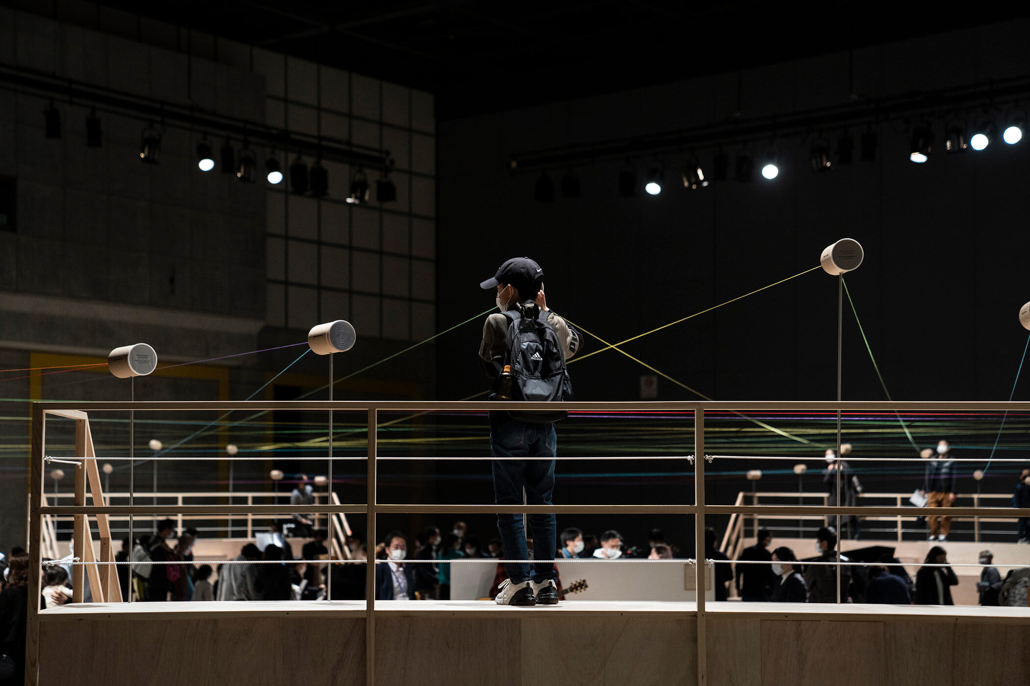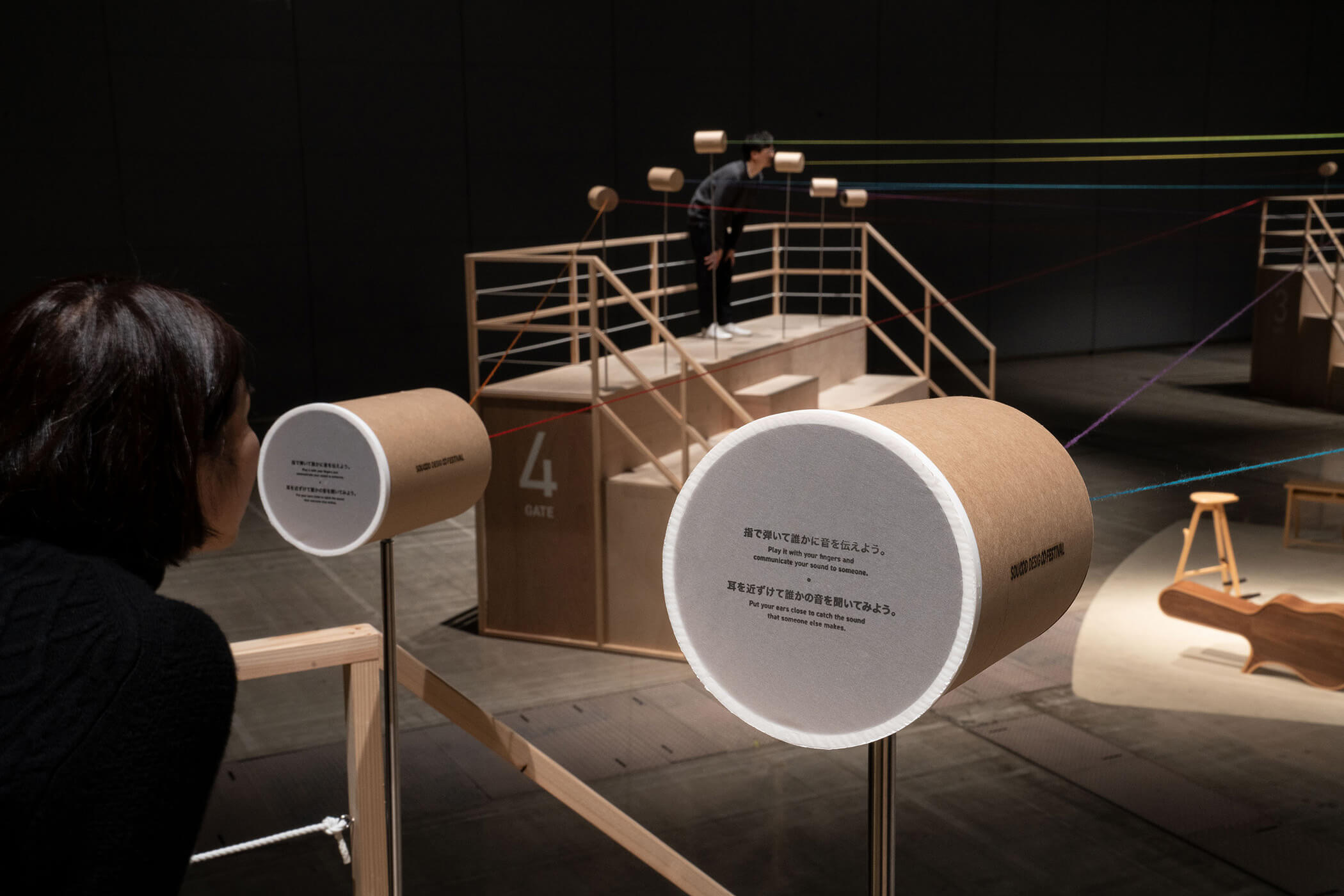 Communication seems to be something that cannot be visualized, but acoustic transmission is always accompanied by the vibration of a physical medium. In order to maximize the significance of the physical festival, we focused on this tangible nature of “sound” and produced a space composed of string phones. Seven staircases are arranged within the space to form a circle, and six string phones are placed at the top of each. The colorful strings, some as long as 30 meters, connect the phones and draw a geometric pattern that serves as a roof over the exhibition space, welcoming visitors with joyful colors. At the venue, the string phones invite people to enjoy communicating through sounds. The staircases act as viewing points for visitors who enjoy sound performances unfolding before them, forming a circle like those formed spontaneously around a street musician. Beneath the 42 sound-transmitting strings, visitors meet various sound design works.