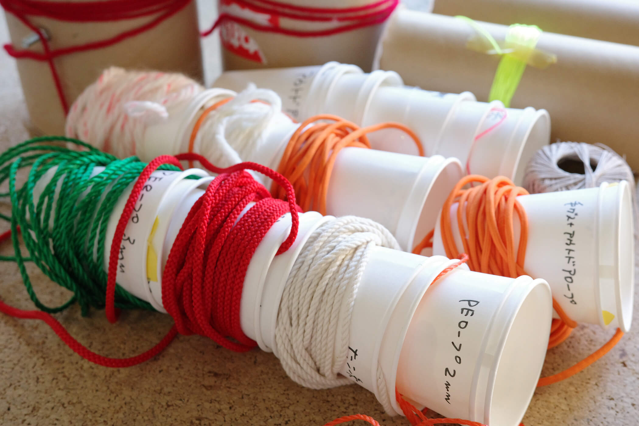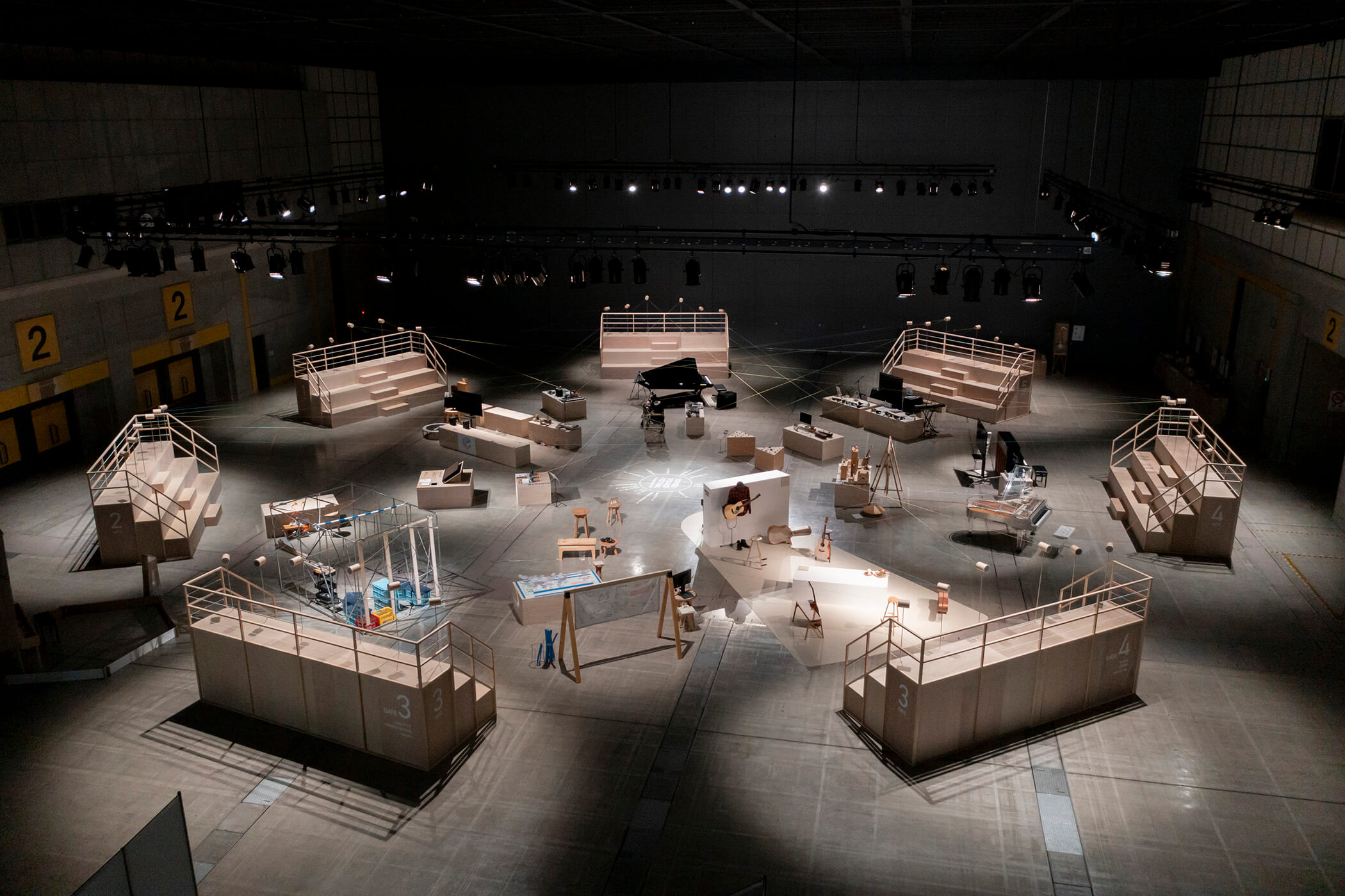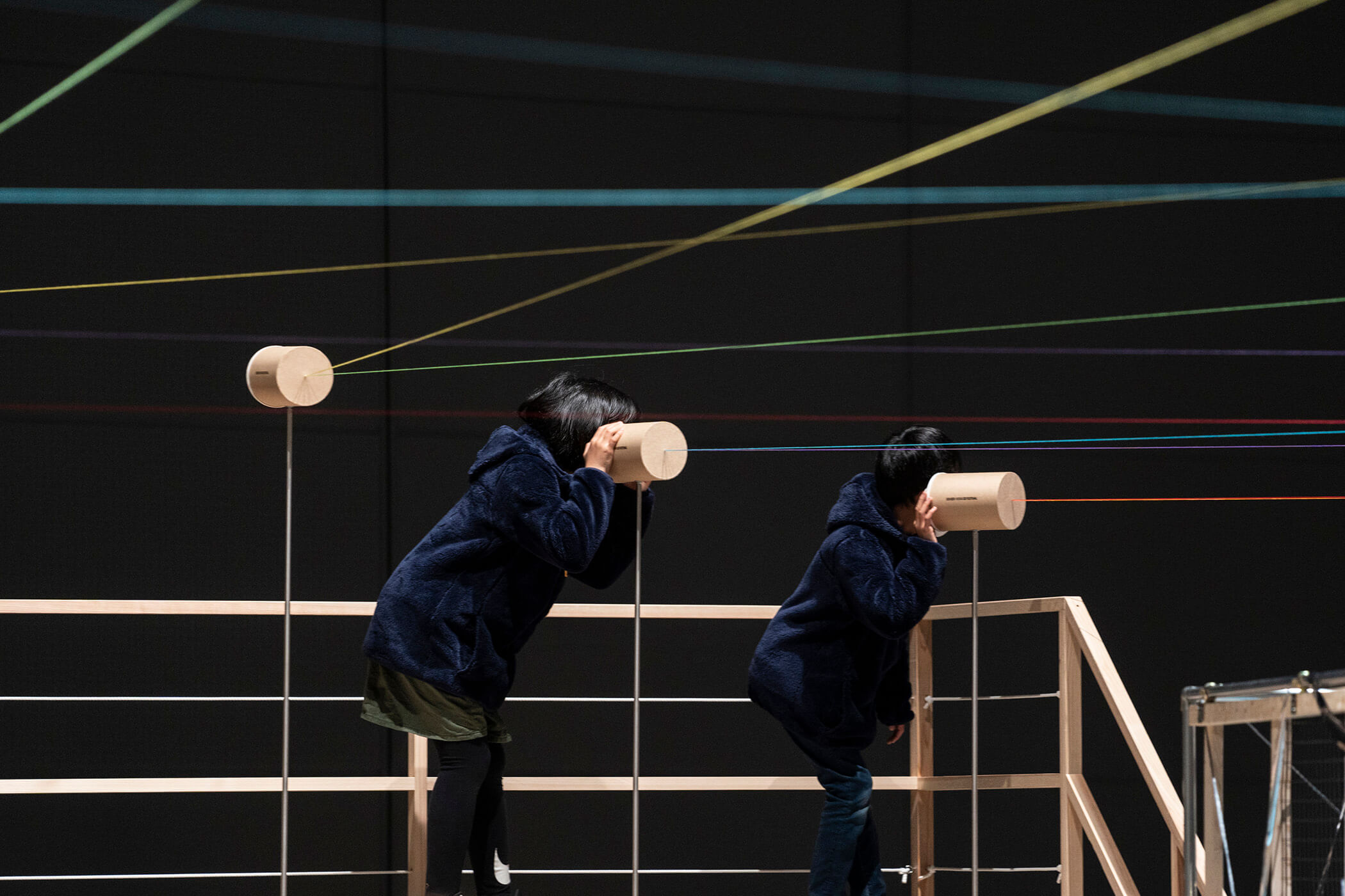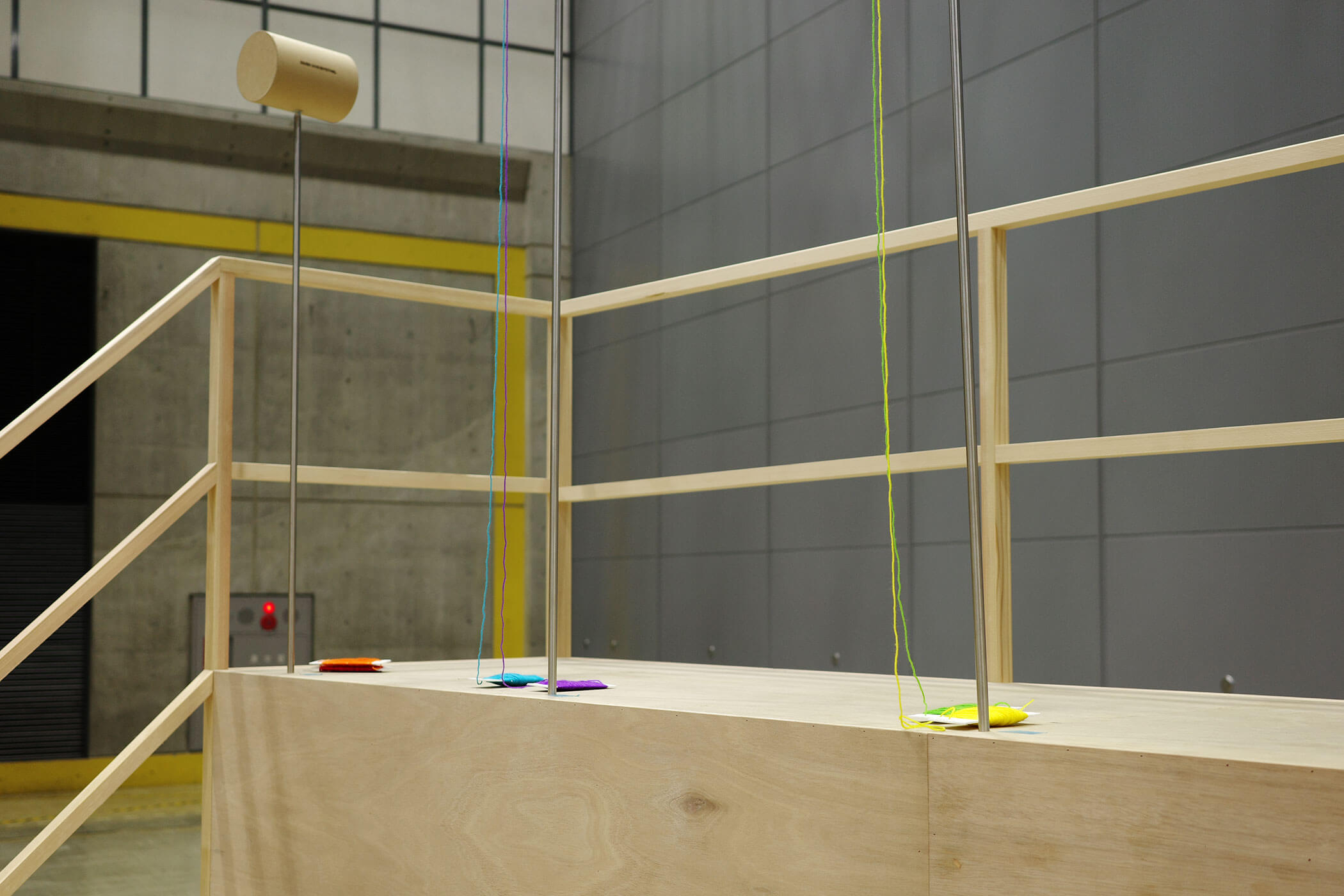 Communication seems to be something that cannot be visualized, but acoustic transmission is always accompanied by the vibration of a physical medium. In order to maximize the significance of the physical festival, we focused on this tangible nature of “sound” and produced a space composed of string phones. Seven staircases are arranged within the space to form a circle, and six string phones are placed at the top of each. The colorful strings, some as long as 30 meters, connect the phones and draw a geometric pattern that serves as a roof over the exhibition space, welcoming visitors with joyful colors. At the venue, the string phones invite people to enjoy communicating through sounds. The staircases act as viewing points for visitors who enjoy sound performances unfolding before them, forming a circle like those formed spontaneously around a street musician. Beneath the 42 sound-transmitting strings, visitors meet various sound design works.