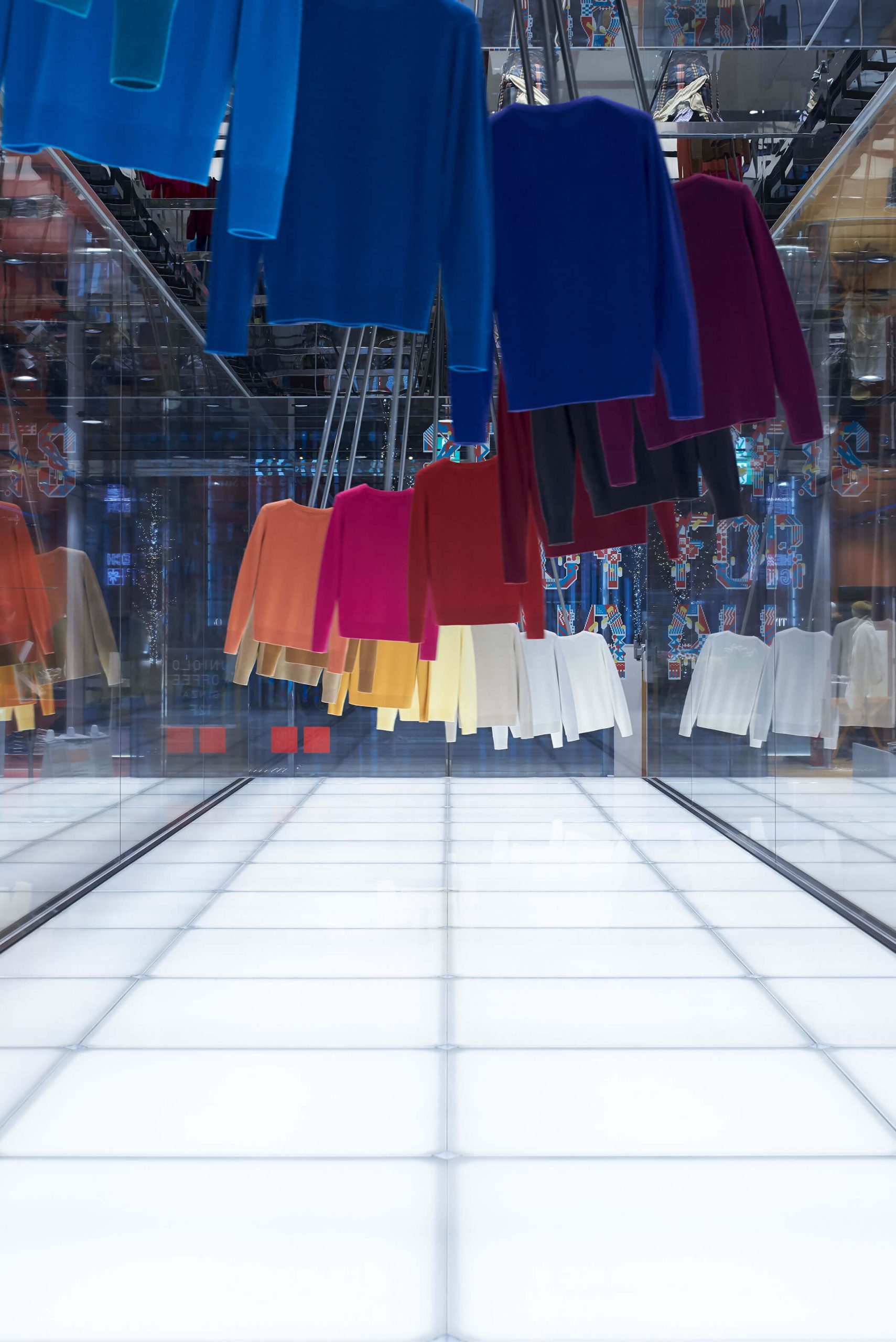 A pendulum artwork made of cashmere knit with 20 different colors welcomes customers at the first-floor entrance. The store was designed to both provide a shopping experience and create a museum-like setting for presenting the innovation and technology behind UNIQLO’s signature products (such as Ultra Light Down, 3D Knit, and HEATTECH), the craftsmanship behind making high-quality clothing, and initiatives for sustainability.